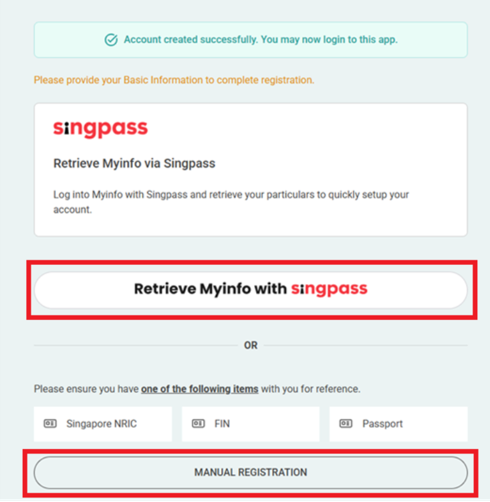 4. After clicking “NEXT,” a confirmation message will appear, indicating that your JP Pass account has been successfully created. You will then be directed to provide your basic information, either by retrieving it through Singpass or entering it manually.